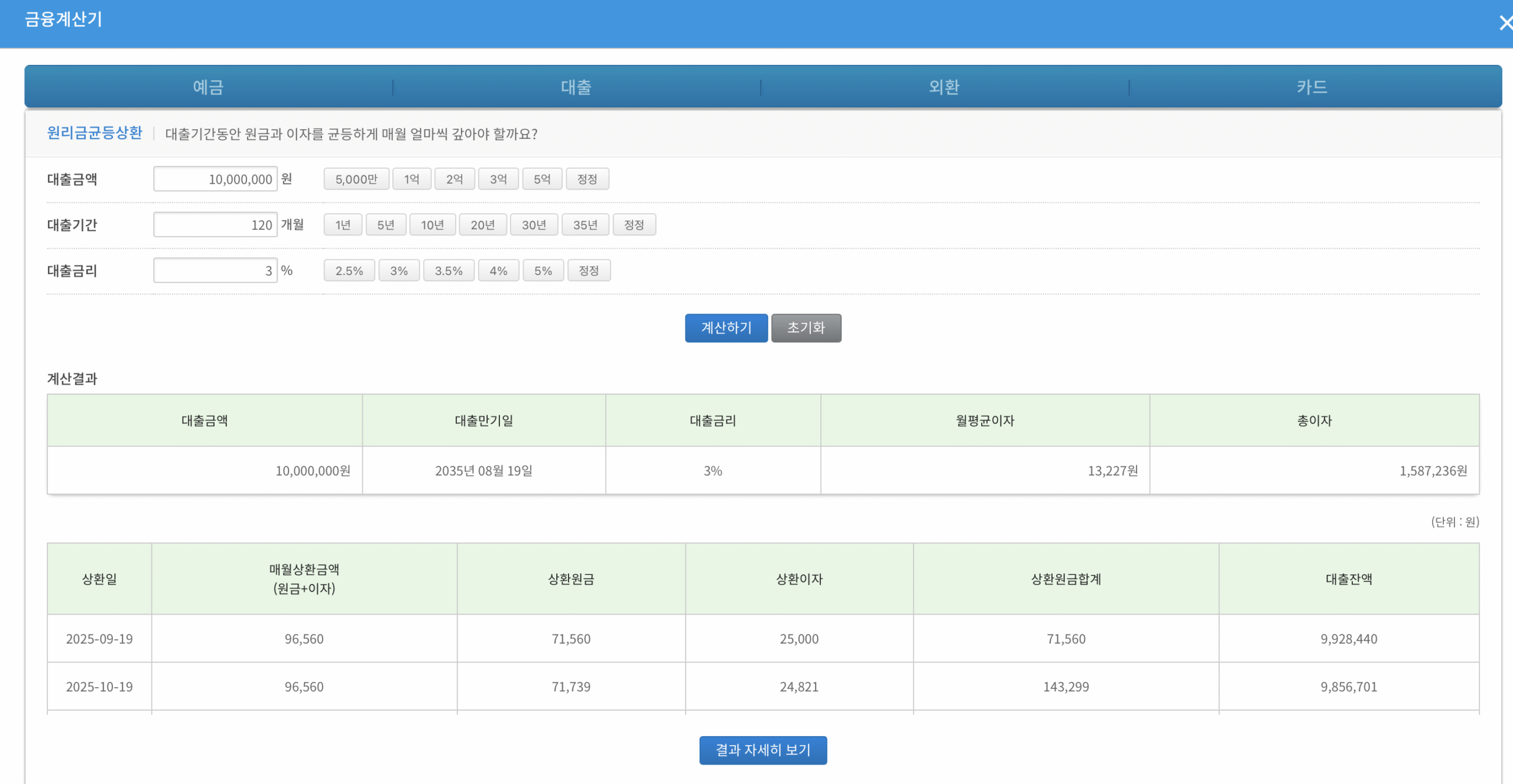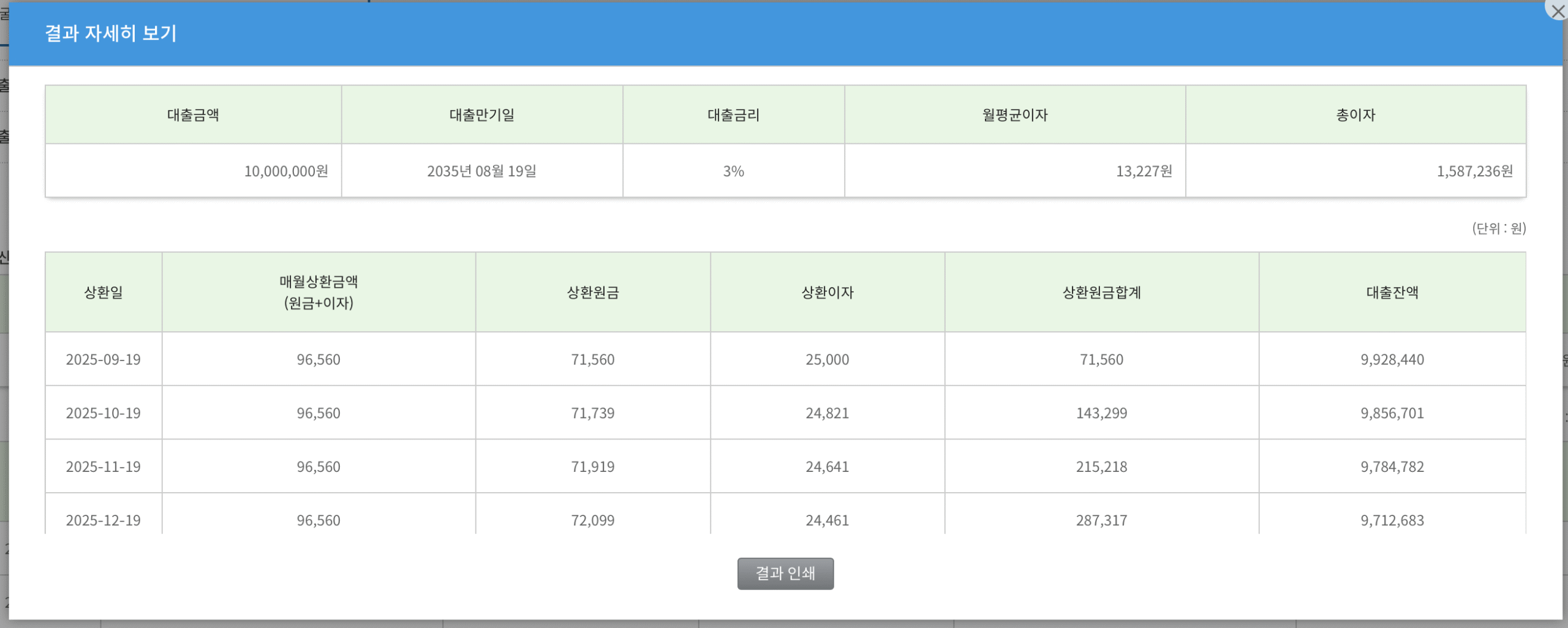 결과 자세히 보기 버튼을 누리시면 다달히 계산되는 금액도 볼 수 있습니다.