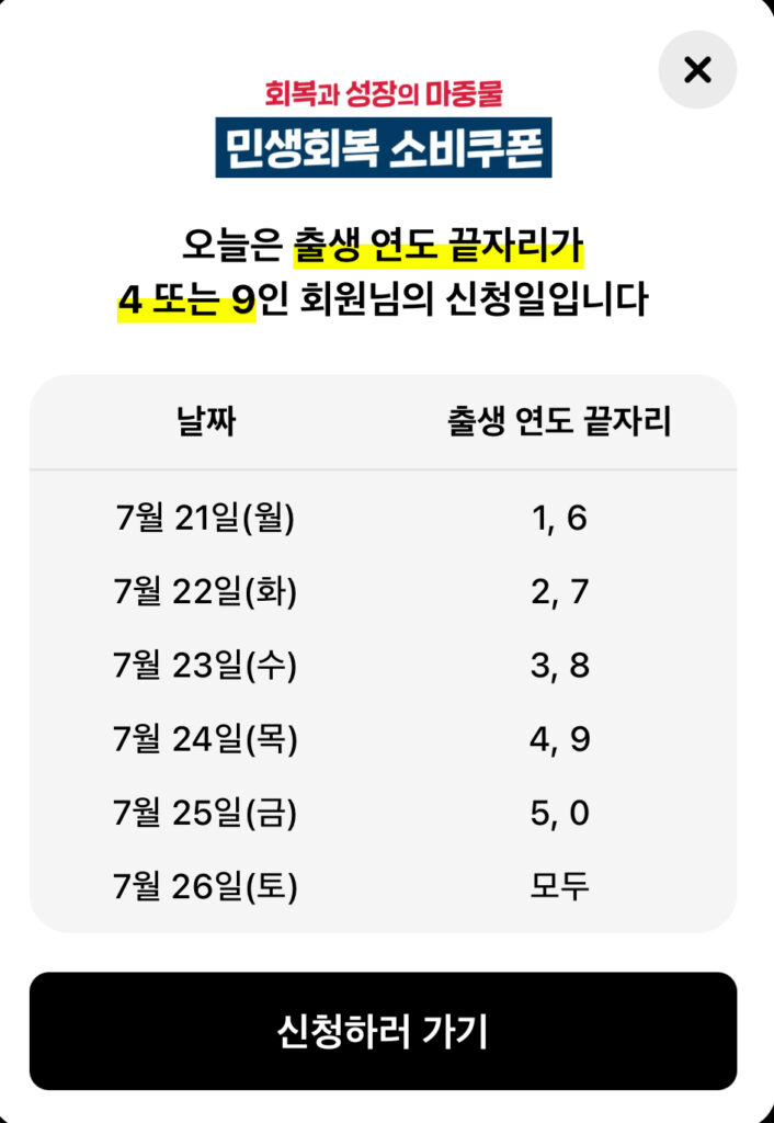 - 7월 26일까지만 출생연도 끝자리에 따라 요일별로 신청 가능합니다.