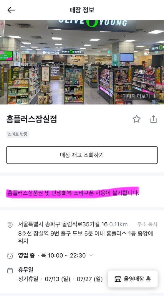 올리브영도 마찬가지로, 해당 앱이나 네이버 지도에서 해당 지점 검색 뒤 클릭해보면 아래와 같이 표시되어 있습니다.