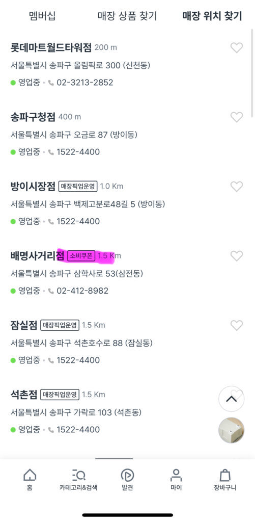 다이소의 경우에는, 다이소 앱에서 매장 위치를 검색하세요. 민생 지원금이 사용 가능한 경우에는 아래 사진과 같이 <소비쿠폰>이라고 표시되어 있습니다.