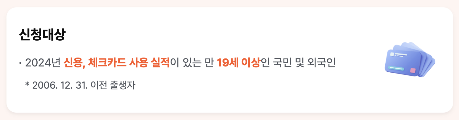24년 신용 및 체크 카드 사용 실적이 있는 만 19세 이상의 국민 및 외국인