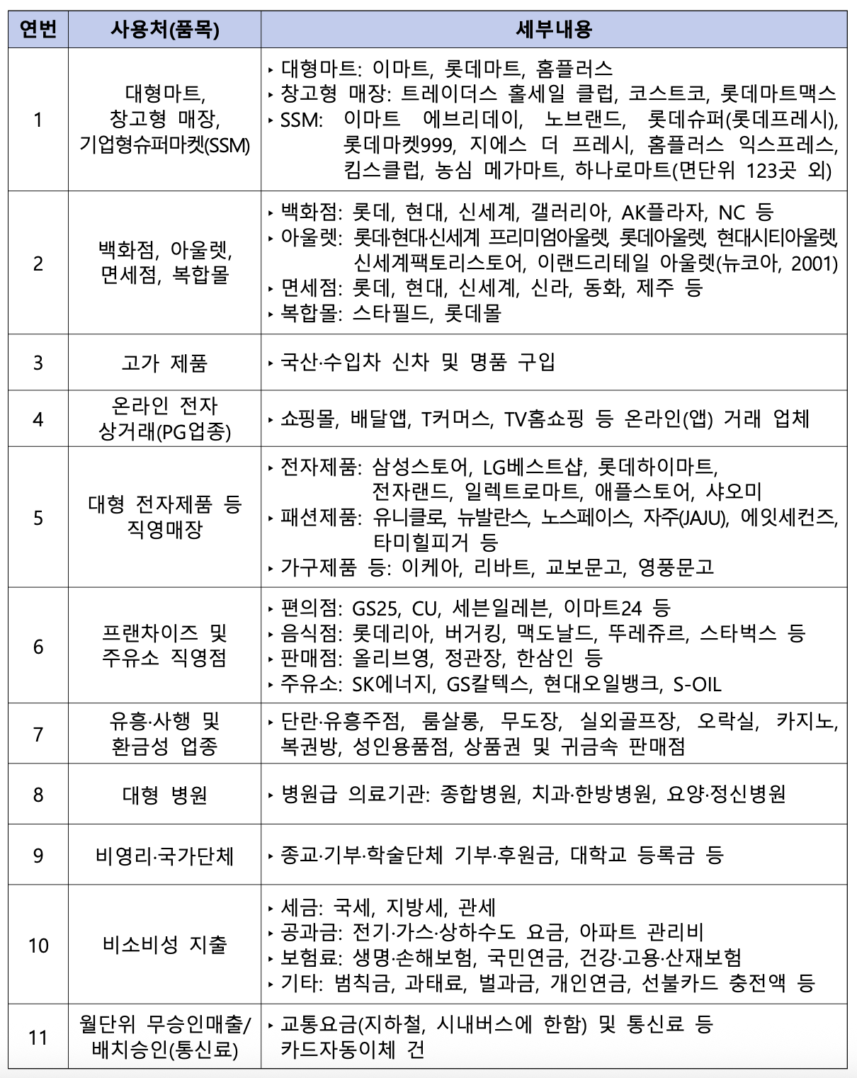 많이 소비되는 대형 마트(이마트, 코스트코, 대형 하나로마트 등), 백화점 및 아울렛, 온라인 거래(배달앱, 쇼핑몰 등), 대기업 프랜차이즈(직영점) 등은 모두 제외 대상이니 주의하세요!