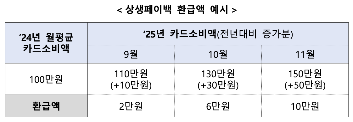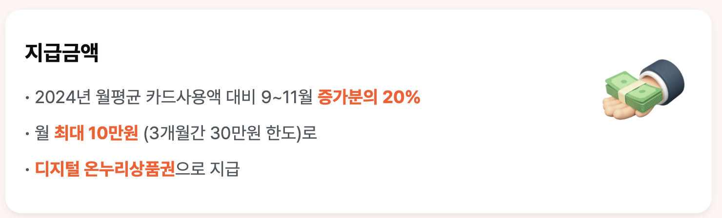따라서 24년 대비 25년 9,10,11월의 사용 금액이 많이 증가하더라도, 최대 지급액은 10만원 한도이니 잘 계산하셔서 계획을 짜시면 좋을 것 같습니다!