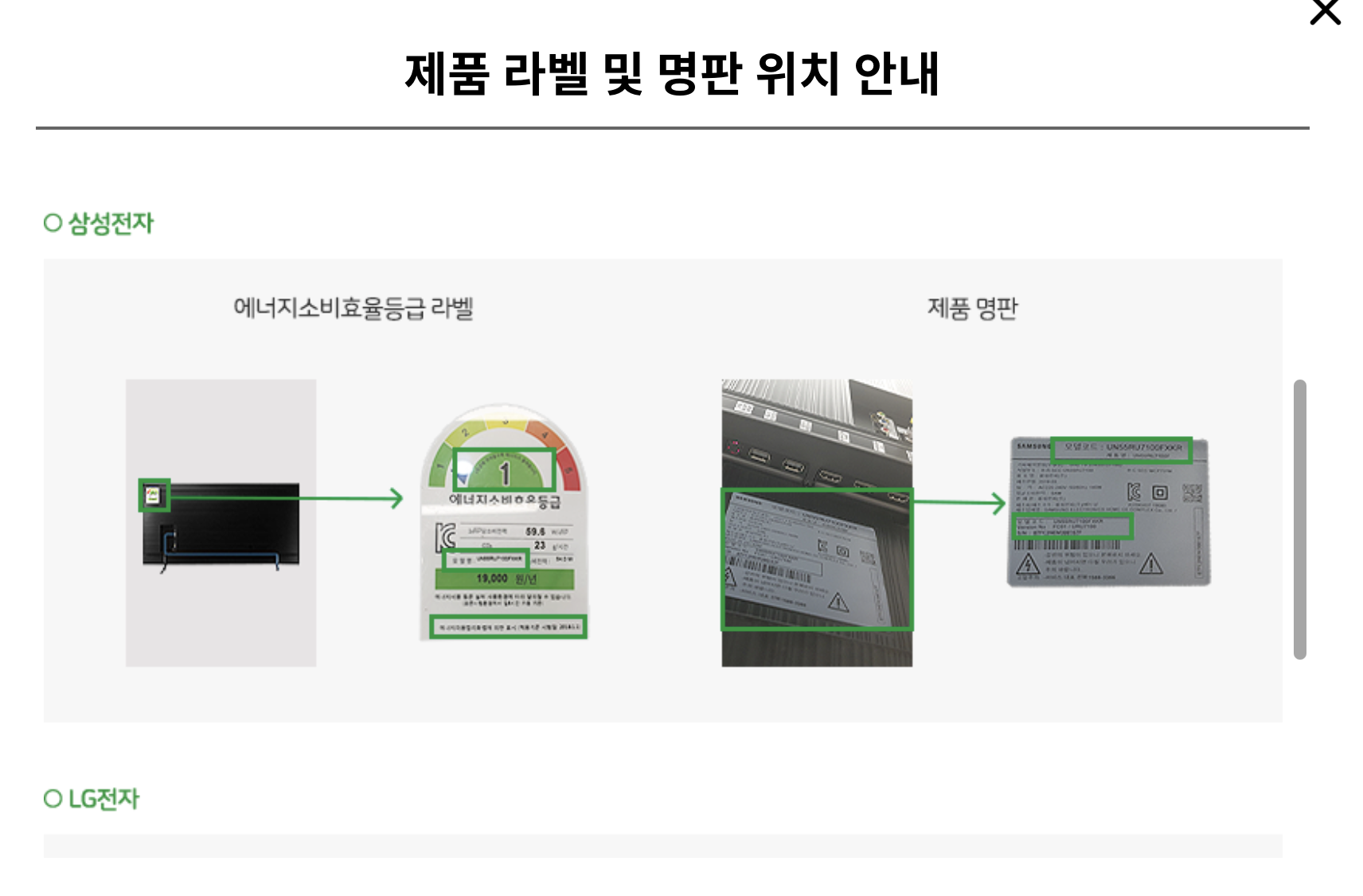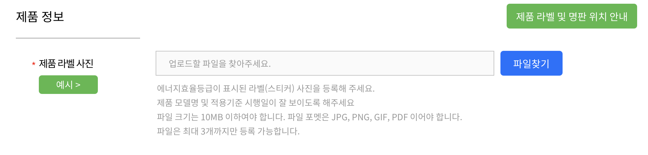 예시 버튼을 클릭하면, 제조 회사 별로 제품 라벨과 명판이 부착되어 있는 위치를 확인할 수 있습니다.