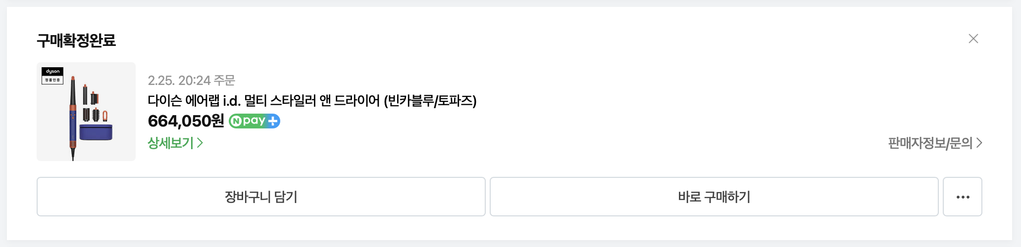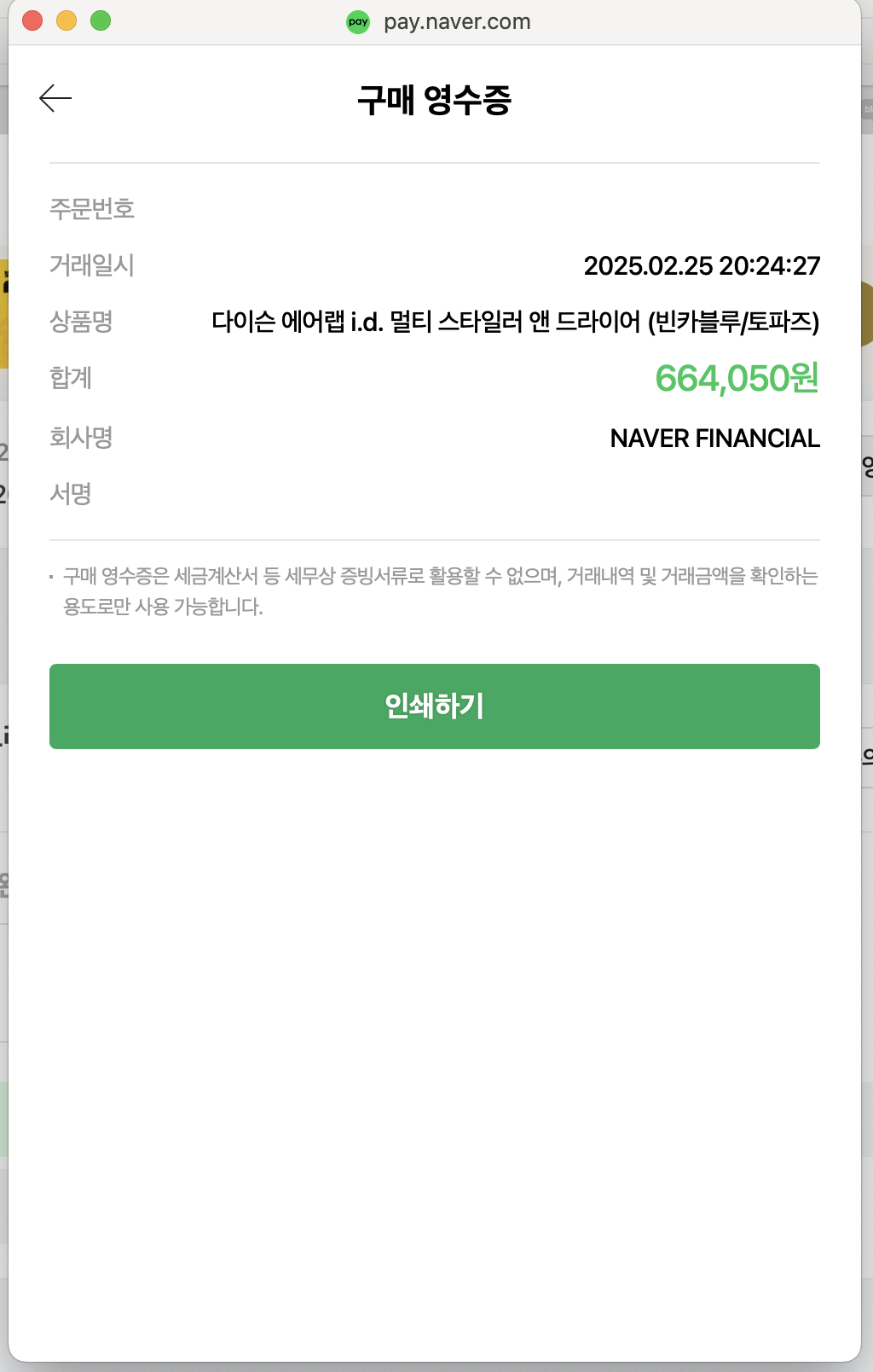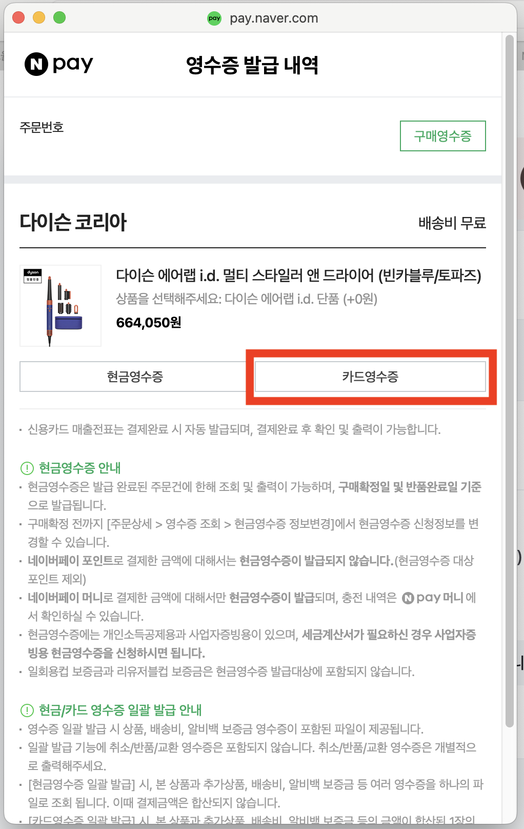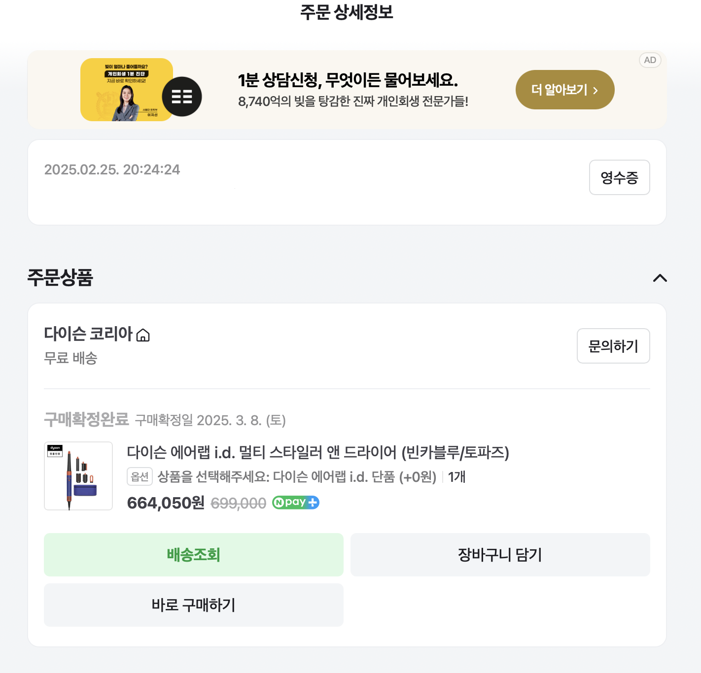 ✅ 네이버 마이 쇼핑 > 주문/배송 내역에서 주문한 상품을 확인해주세요. 저는 다이슨을 예시로 들어볼게요. (환급 대상은 아닙니다!)